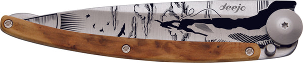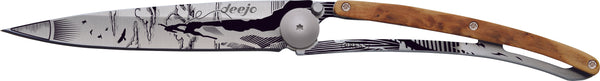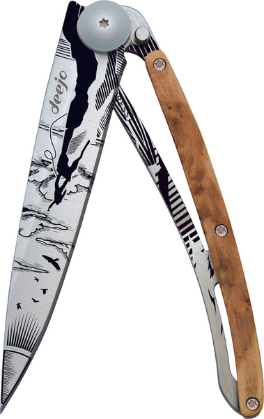 Ultra-light knife in stainless steel Z40C13, matte finish. Blade with 'liner lock' type safety notch decorated with a fine laser engraving. Belt clip. The handle is decorated with a juniper magnifying glass wafer. Juniper is a naturally fragrant wood, from which a slightly peppery scent emerges. All in an arabesque of beiges, each wafer, finely ribbed, makes your Deejo a unique and precious piece.